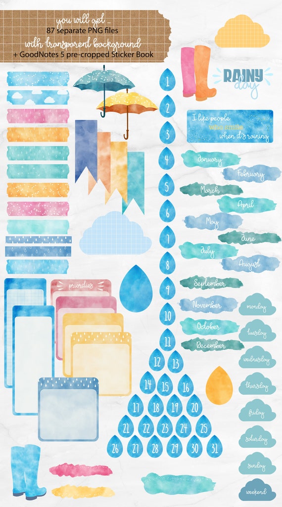 Rainy Day Watercolor Digital Stickers Clip Art Png Etsy